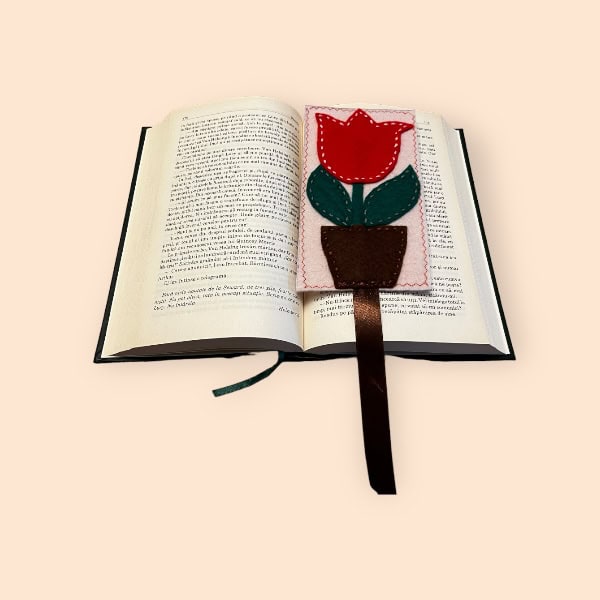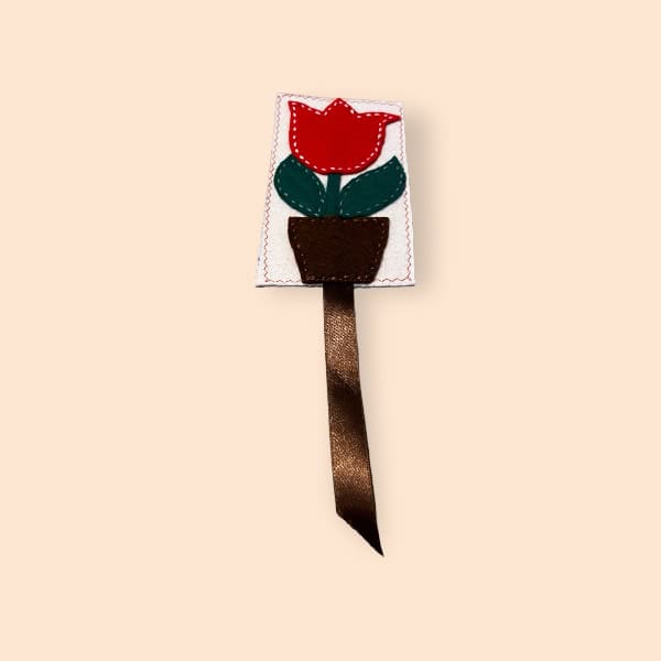 Semn de carte cusut manual 20×10 cm Ghiveci cu trandafir